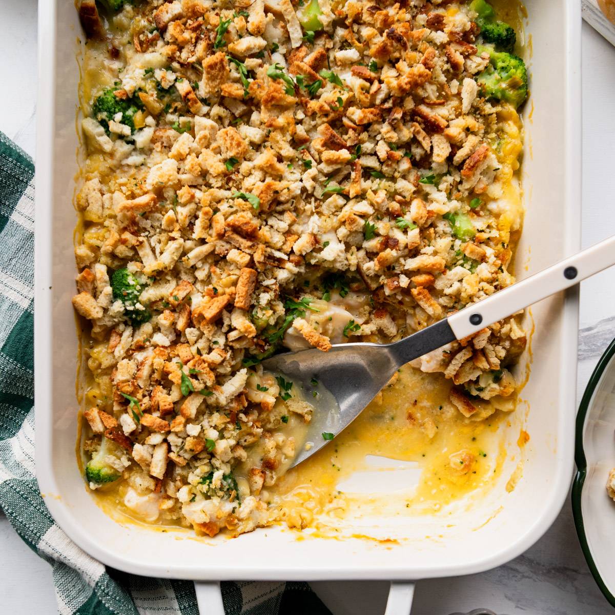 โDump-and-Bake Chicken Broccoli Pasta CasseroleโComfort food at its easiest! Tender pasta, juicy chicken, and broccoli bake together in a rich, cheesy sauce and get topped with a crispy, buttery crumb topping. No boiling, no pre-cooking, and just one dish to clean.