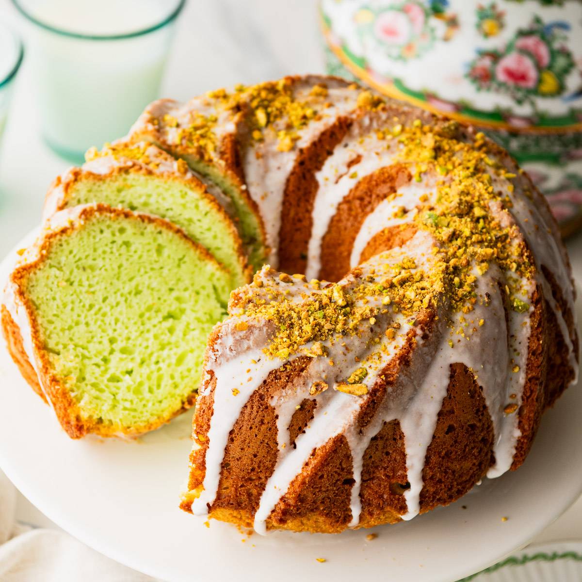 โPistachio Pudding Cake (with Cake Mix)โThis vintage pistachio Bundt cake starts with a box of cake mix and a packet of pistachio pudding for a moist, tender dessert with a pale green crumb and a sweet almond glaze. It comes together with about 15 minutes of prep, and it looks far more impressive than that!