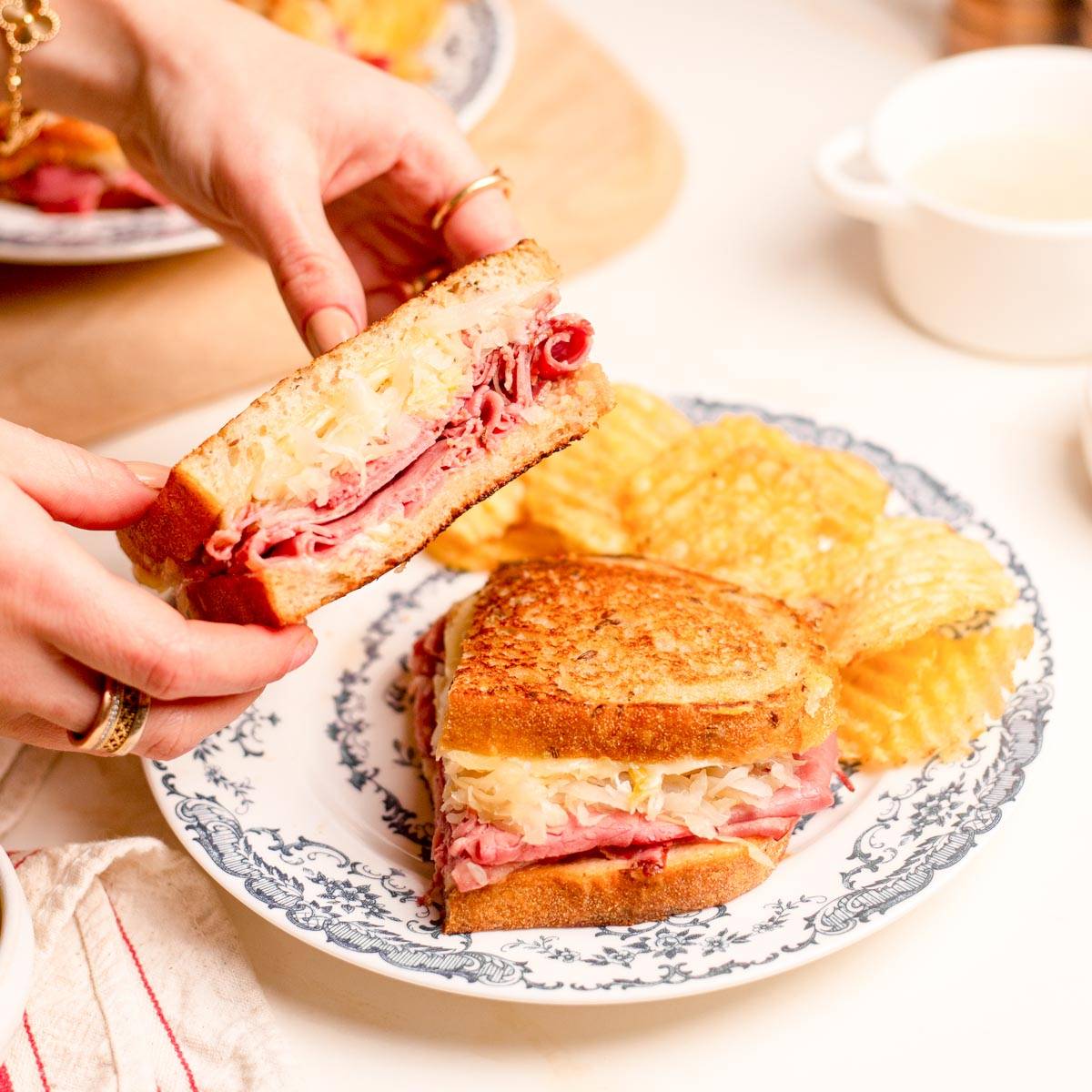 โReuben SandwichesโThis homemade sandwich stacks tender deli pastrami (or corned beef) with tangy sauerkraut, melty Swiss cheese, and a quick homemade Russian dressing, all griddled between buttered slices of rye bread until golden and crispy.